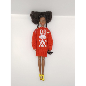 Ярко-красное платье-свитер для пухлой куклы Барби с принтом «Заяц» и стразами. Ручная работа, эксклюзивный дизайн для размера оверсайз. Уютный и стильный наряд. Подарок в фирменной коробке.