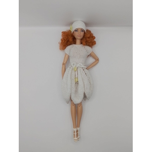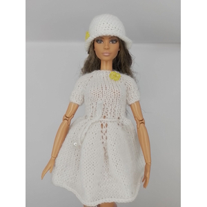 Нежный комплект для Барби «Подснежник» ручной работы. Белое платье с юбкой-лепестками, украшенное жемчужными бусинами, и шапочка с изящной желтой бабочкой. Уникальный дизайн, идеальная посадка. Подарок в фирменной коробке с вешалкой.