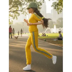 Эксклюзивный вязаный спортивный костюм для куклы Барби. Ярко-желтый комплект с болотной отделкой и стильной бейсболкой. Ручная работа, идеальная посадка. В комплекте вешалка для хранения.