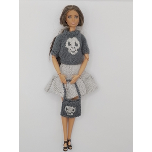 Стильный комплект для куклы Барби. Юбка-солнце серого цвета, кофта с принтом "Череп" и сумка. Современный дерзкий образ. В комплекте вешалка для хранения. Полное описание: