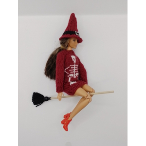 Карнавальный костюм для куклы Барби 'Хеллоуин' (ведьма в бордовом с принтом "Скелет") с метлой, шляпой и вешалкой, карнавальный набор, праздничный аксессуар