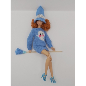 Голубой карнавальный костюм Ведьмы для куклы Барби! Платье-свитер с принтом "Приведение", колпак, метла и вешалка. Нежный хеллоуинский образ. Полный набор для игр и коллекции. Подарок в фирменной коробке.